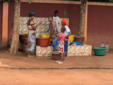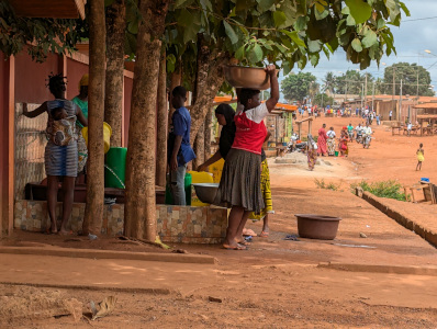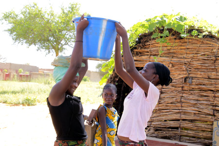 En Afrique de l’Ouest, à la ville comme à la campagne, les femmes sont entièrement responsables de l’eau pour la vie quotidienne de la famille : boire, faire la cuisine, se laver, faire la lessive. Pour des millions de femmes ou de petites filles, l’eau n’est pas disponible dans la maison ou même dans la concession. Il leur faut faire quelques centaines de mètres, parfois quelques kilomètres, avec un récipient qui, une fois rempli, sera transporté le plus souvent sur la tête. Malgré ces lourdes contraintes, borne-fontaines, forages, puits et mares sont des lieux de vie et de socialisation, d’entraide et d’échanges joyeux.